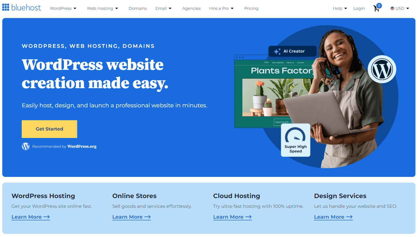 Bluehost’s range of hosting types, strong features, and affordable beginner plans make it a dependable hosting provider. That’s why we’ve rated it the best overall hosting provider on the market. Bluehost is also the best choice you can make if you’re hosting a WordPress site – it’s earned the title of best for WordPress hosting in our research, and WordPress itself has been recommending Bluehost since 2005. We also think it’s pretty great for ecommerce website hosting, if that’s your kind of thing.